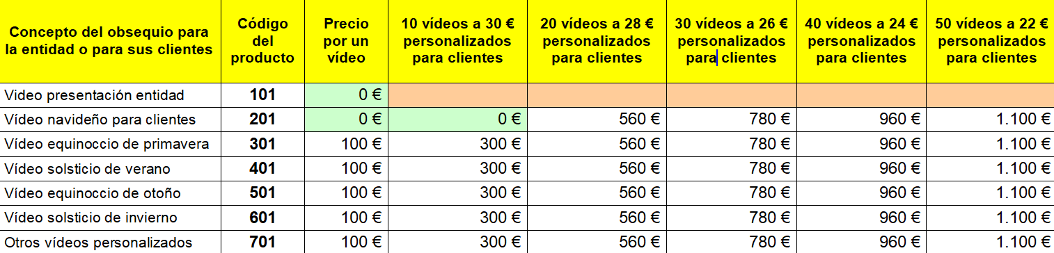 Por otra parte durante el mes de diciembre, si la suscripción sigue vigente, también recibirá con carácter gratuito 10 vídeos breves, personalizados con el nombre, logo e imágenes de su entidad, más el nombre de sus clientes para que pueda felicitarles la entrada en el solsticio de invierno, las Navidades y el Año Nuevo… si aparte de esos 10 vídeos de obsequio precisa más unidades, porque el número de sus clientes prioritarios es superior, podemos brindarle los que nos solicite, todos igualmente personalizados para cada cliente y listos de envío directo y separado a cada uno de ellos por un precio muy asequible que puede verse en el cuadro siguiente…